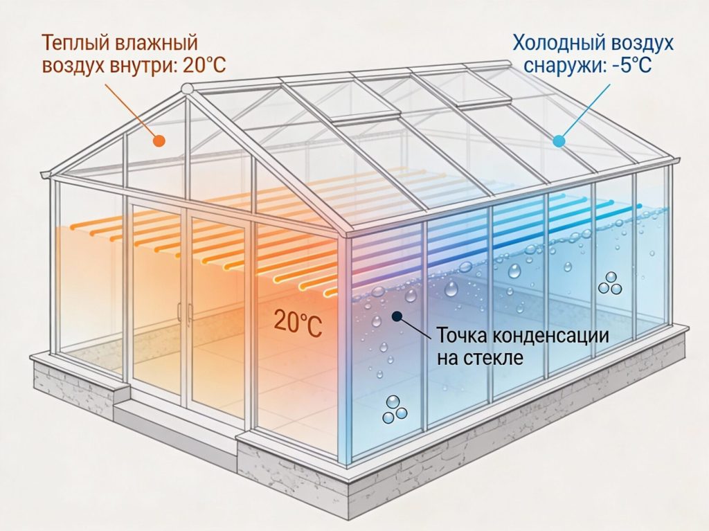 Вывод: при комнатной температуре +20°C и влажности 85% (характерной для зимнего сада с растениями) точка росы составит +17°C. Если стекло охладится до +10°C — конденсат гарантирован.