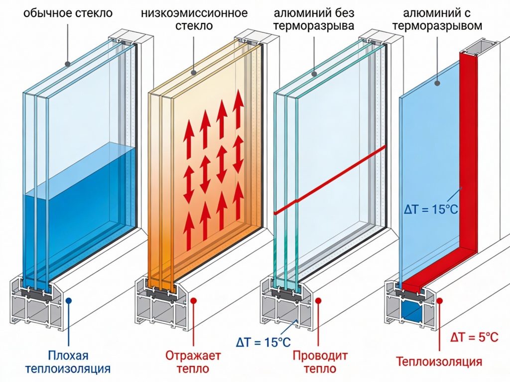 🔍 Сравнение остекления: обычное vs низкоэмиссионное стекло, алюминий без и с терморазрывом