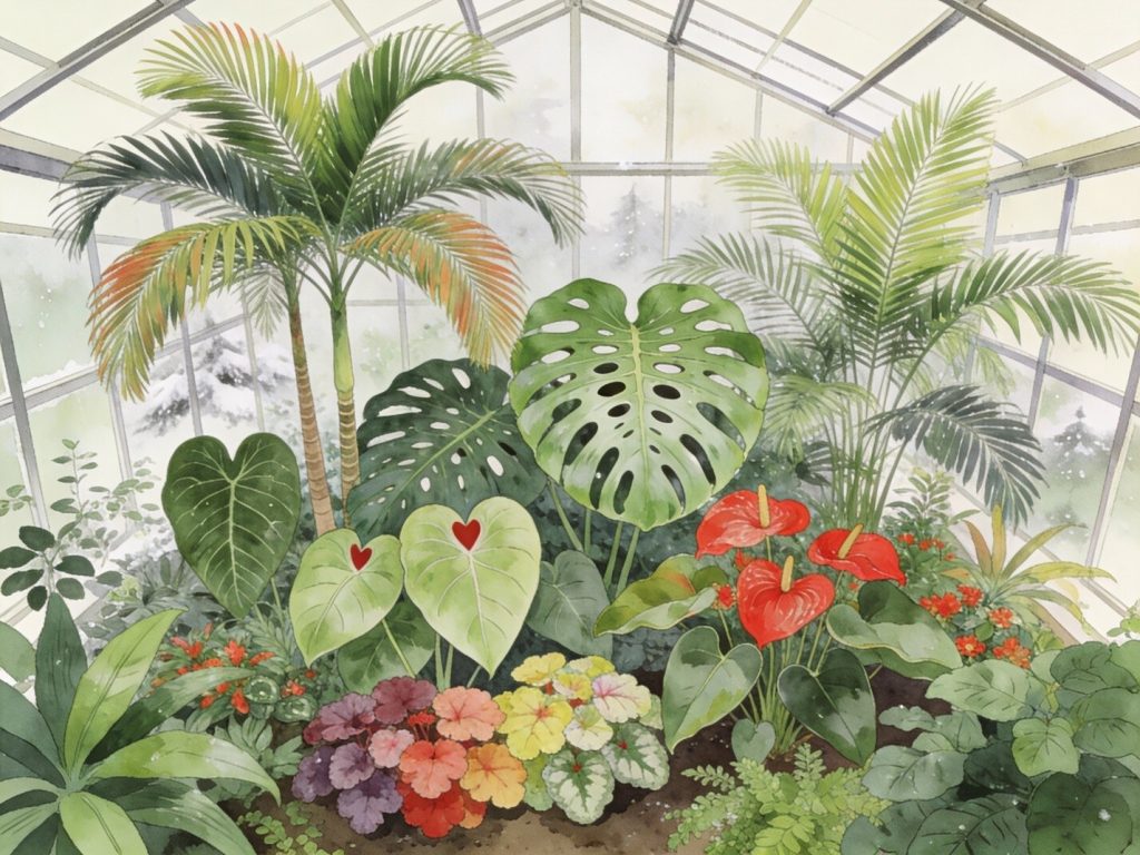 Тропические растения требуют теплого климата (20-25°C) и высокой влажности (70-85%). Эти требовательные красавцы идеальны для настоящих зимних садов с мощной системой увлажнения. Они включают монстеру, филодендрон, антуриум, бегонию и другие экзотические виды.